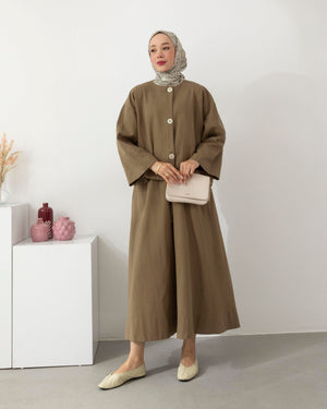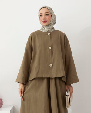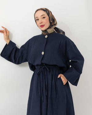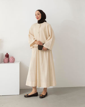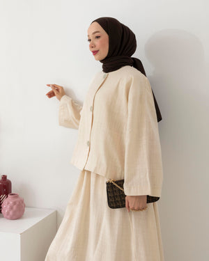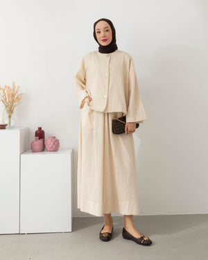 استعدي للتألق بإطلالة منعشة وخفيفة مع طقمنا المصنوع من قماش الكتّان الطبيعي، الذي يجمع بين الأناقة والبساطة في تصميم واحد. يأتي الطقم ببلوزة بطول 55 سم بتفاصيل أزرار أنيقة، وتنورة بطول 95 سم تضيف لمسة أنثوية ناعمة بلمعة خفيفة وقصة مريحة.