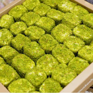 إنه نوع من الحلقوم التركي اللذيذ، بطبقتين من الحلقوم التركي الناعم، مغطى بالفستق الكامل، ومغطى بمسحوق الفستق الطازج.