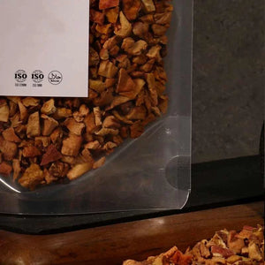 مصنوع من فواكه مجففة حقيقية ، بدون إضافات. تحتوي المنتجات على حوالي 80-85٪ ماء قبل التجفيف. نتيجة التجفيف ، يتم استخدام ما يقرب من 6 كجم من المنتج والحصول على 1 كجم من المنتج. أثناء التجفيف ، يتبخر الماء الموجود في المنتج ويبقى قلب المنتج.
