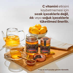 تركيبة مثالية تجمع بين العسل الطبيعي الخام المستخرج من زهور البر النقية، مع فيتامين C المعروف بدوره الأساسي في تقوية جهاز المناعة ومكافحة التعب والإرهاق.