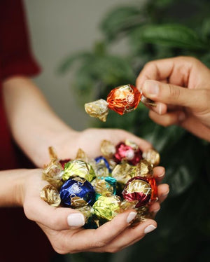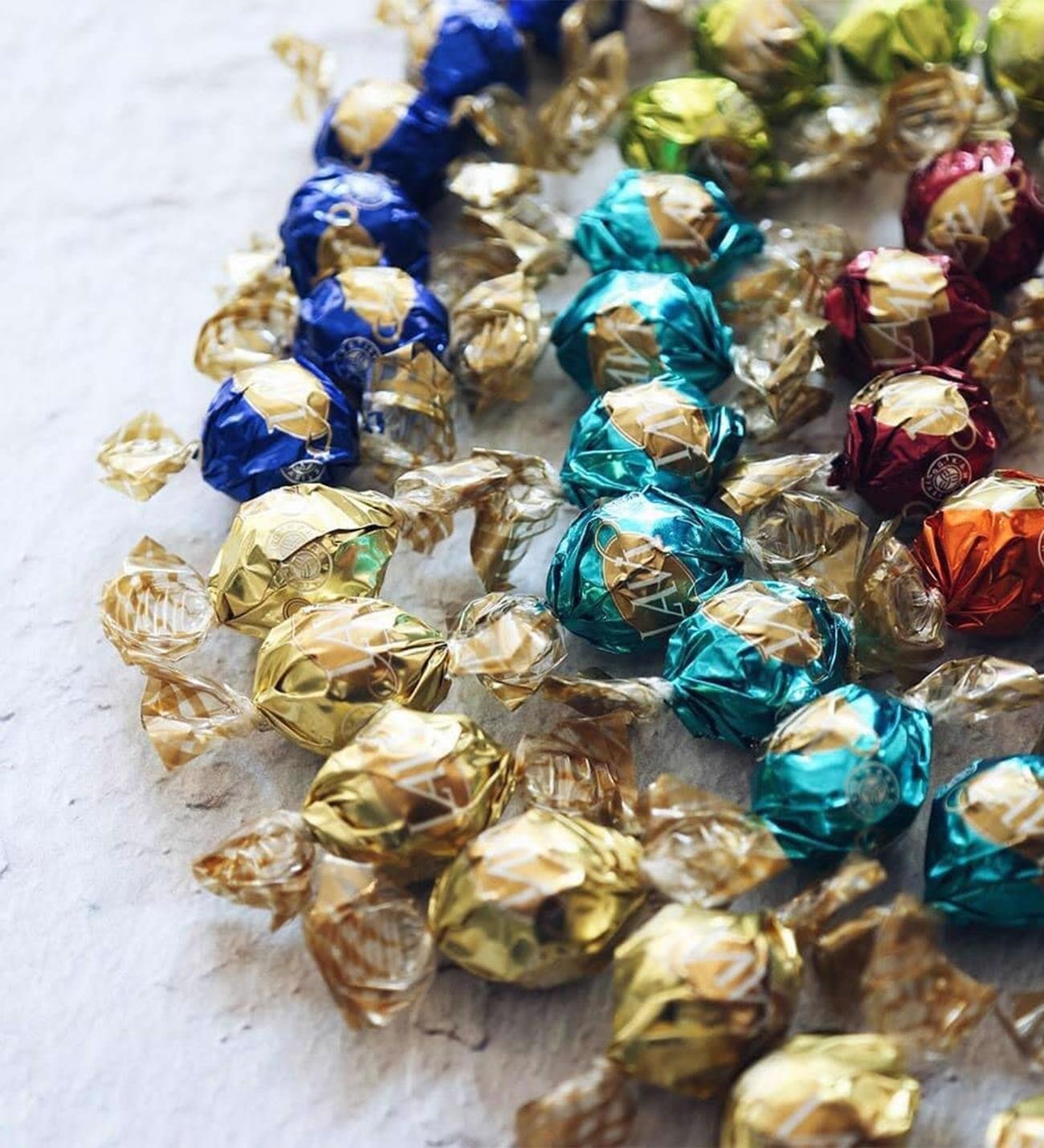 شوكولاتة لذيذة مع الحليب والكراميل والبندق والتوت والقهوة ونكهة الفستق مع حشوة الشوكولاتة الناعمة.