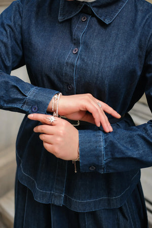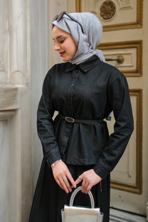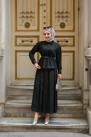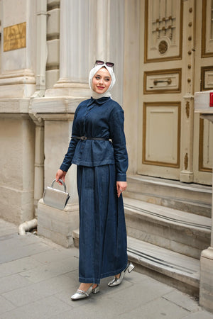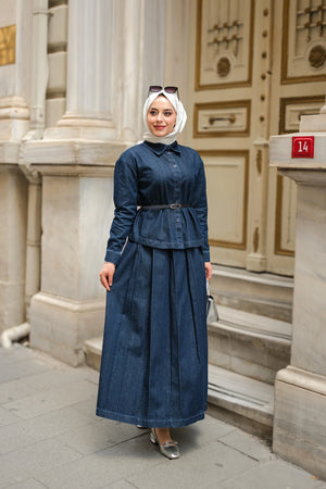 تميّزي بإطلالة أنيقة مع طقم المصنوع من قماش الجينز الفاخر بجودة مزود بحزام جلد فعّال ليمنحك لمسة عصرية وعملية. تنورة الطقم بطول 90 سم، مناسبة للمرأة العصرية التي تبحث عن الأناقة والراحة في آنٍ واحد.