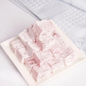 استمتع بالمذاق الرقيق والعطري لراحة الحلقوم بنكهة الورد. هذه الحلوى التقليدية مملوءة بجوهر الورد الرقيق والجذاب، مما يقدم لك تجربة فريدة ومنعشة. مثالية للمناسبات الخاصة أو الاستمتاع اليومي، هذه الحلوى الأنيقة ستأسر حواسك.