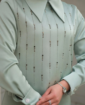 طقم سِراج هو خيارك المثالي لإطلالة تجمع بين البساطة والفخامة. مصنوع من قماش عالي الجودة لا يُظهر ما تحته ولا يسبب أي تهيج، ما يجعله مثاليًا حتى لأيام الصيف. يتميز بتزيين راقٍ بالأحجار في الجزء الأمامي ليمنحك لمسة أنثوية فاخرة. تصميمه المحتشم مناسب للمناسبات المميزة أو الإطلالات اليومية الراقية.