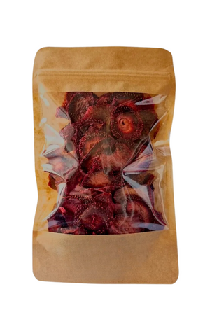 فراولة مجففة : لا يحتوي على مواد مضافة ومواد حافظة وملونات ولا تحتوي على سكر مضاف.