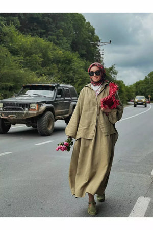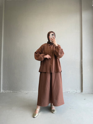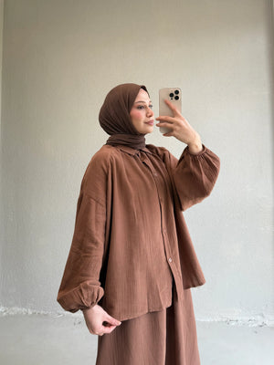 مصنوع من قماش الموسلين الطبيعي والخفيف، مصمم ليمنحك راحة تامة وأناقة بسيطة في آنٍ واحد.