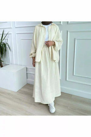 طقم تنوره وقميصمن قماش الموسلين الطبيعي والخفيف مناسب للمحجبات