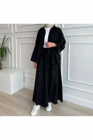 يأتي بقصة مريحة وعصرية تتكون من بلوزة طويلة وتنورة بطول مثالي، ليمنحك إطلالة متناسقة وناعمة طوال اليوم.