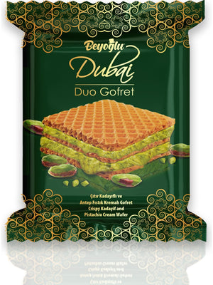 Experience the rich and crunchy delight of Beyoğlu Dubai Duo Gofret, a premium crispy wafer filled with creamy Antep pistachio cream layers. Perfect for snacking with tea or coffee, this pistachio-flavored treat delivers a satisfying balance of nutty richness and delicate crunch.