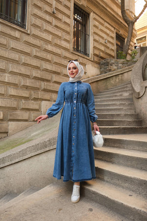 The Dima Dress offers a perfect blend of modest style and daily comfort. Crafted from premium denim fabric, it features front snap buttons for easy wear and elastic support at the waist and cuffs. Feminine, flattering, and practical – ideal for your everyday wardrobe.