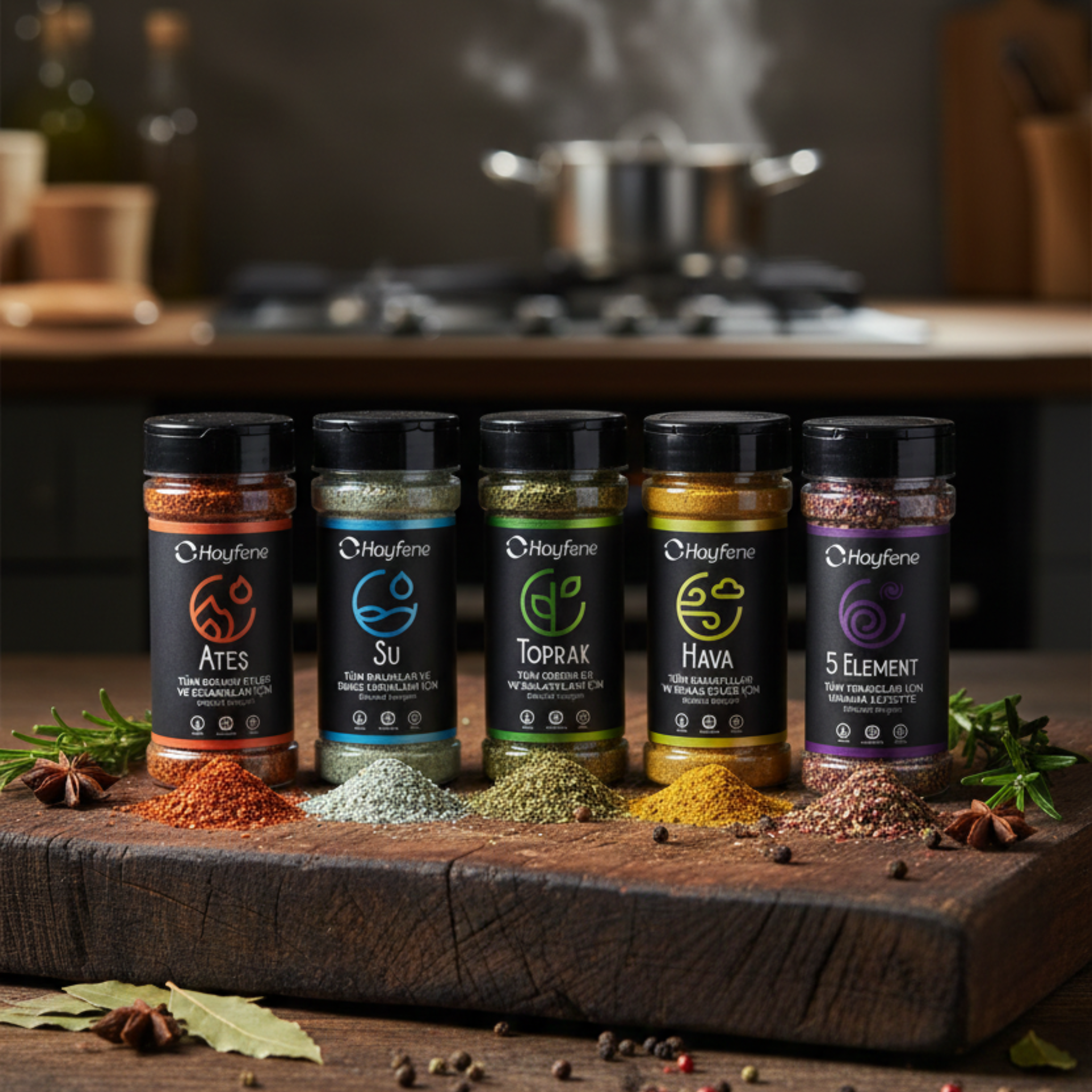 Hayfene Gourmet 5-Element Spice Set offers a unique culinary experience inspired by the four natural elements: Fire, Water, Earth, and Air, along with the 5th Element that adds a magical touch to your dishes.