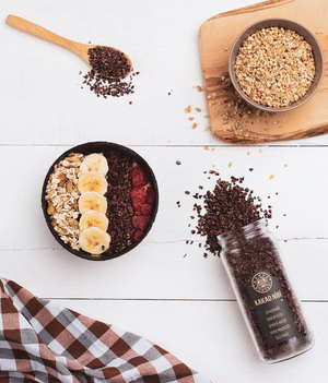 It can be mixed on top of chocolates, mixed with hot chocolate or homemade nut milks, mixed with coconut, almond oil and pureed palm to make energy balls. It can be used instead of chocolate chips in granola recipes or sprinkled on yogurt.