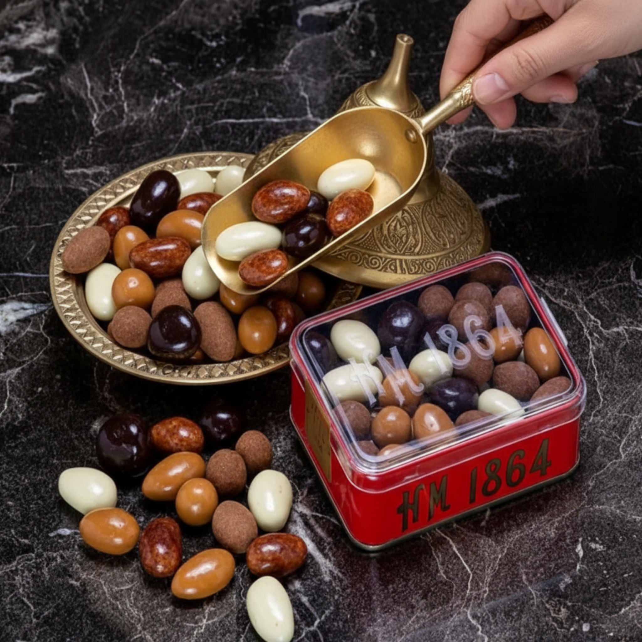 The Hafız Mustafa Mixed Chocolate-Coated Dragees is a delightful assortment of almonds, hazelnuts, and dried fruits like apricots or raisins, covered in dark or white chocolate. Some pieces are finished with cocoa powder or a glossy sugar coating, adding variety to every bite. Packed in a stylish metal gift box, it’s perfect for gifting or enjoying authentic Turkish sweets.