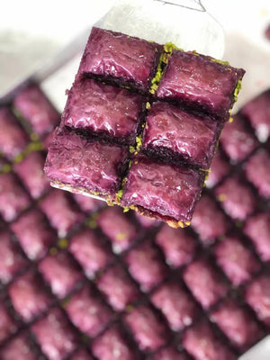 Pistachio Purple Baklava stands out with its naturally vibrant color derived from beetroot or purple potatoes and is filled with premium pistachios. It’s freshly made daily without glucose syrup and sweetened with natural beet sugar. With its delicate layers and rich flavor, it’s a refined and distinctive choice for special occasions and elegant gathering.