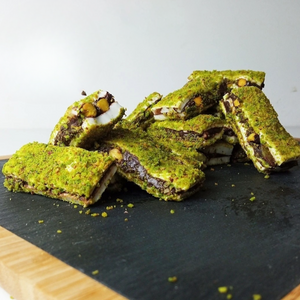 This mouth-watering variety of Turkish delight features whole Antep pistachios sandwiched between two soft layers of delight, generously spread with chocolate, and topped with fresh ground Antep pistachio powder.